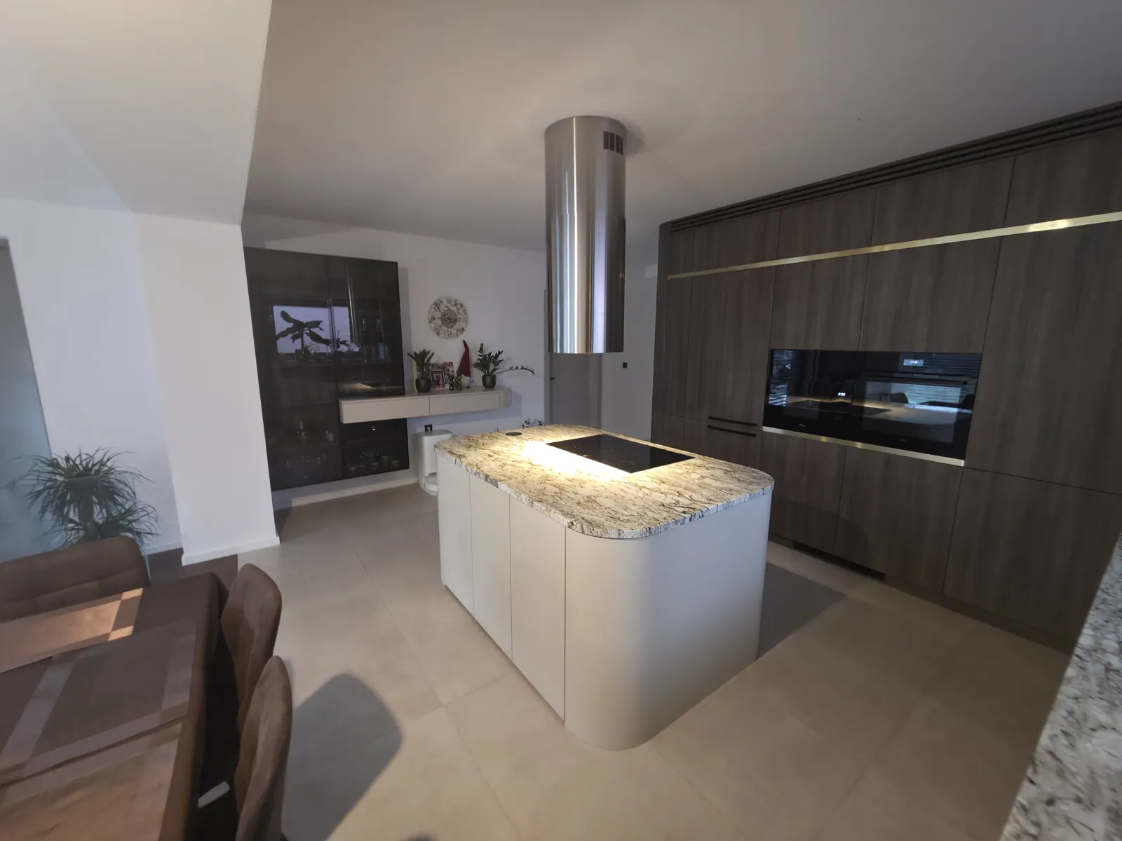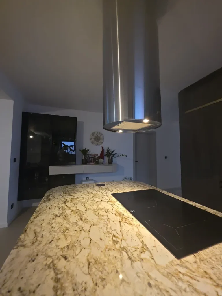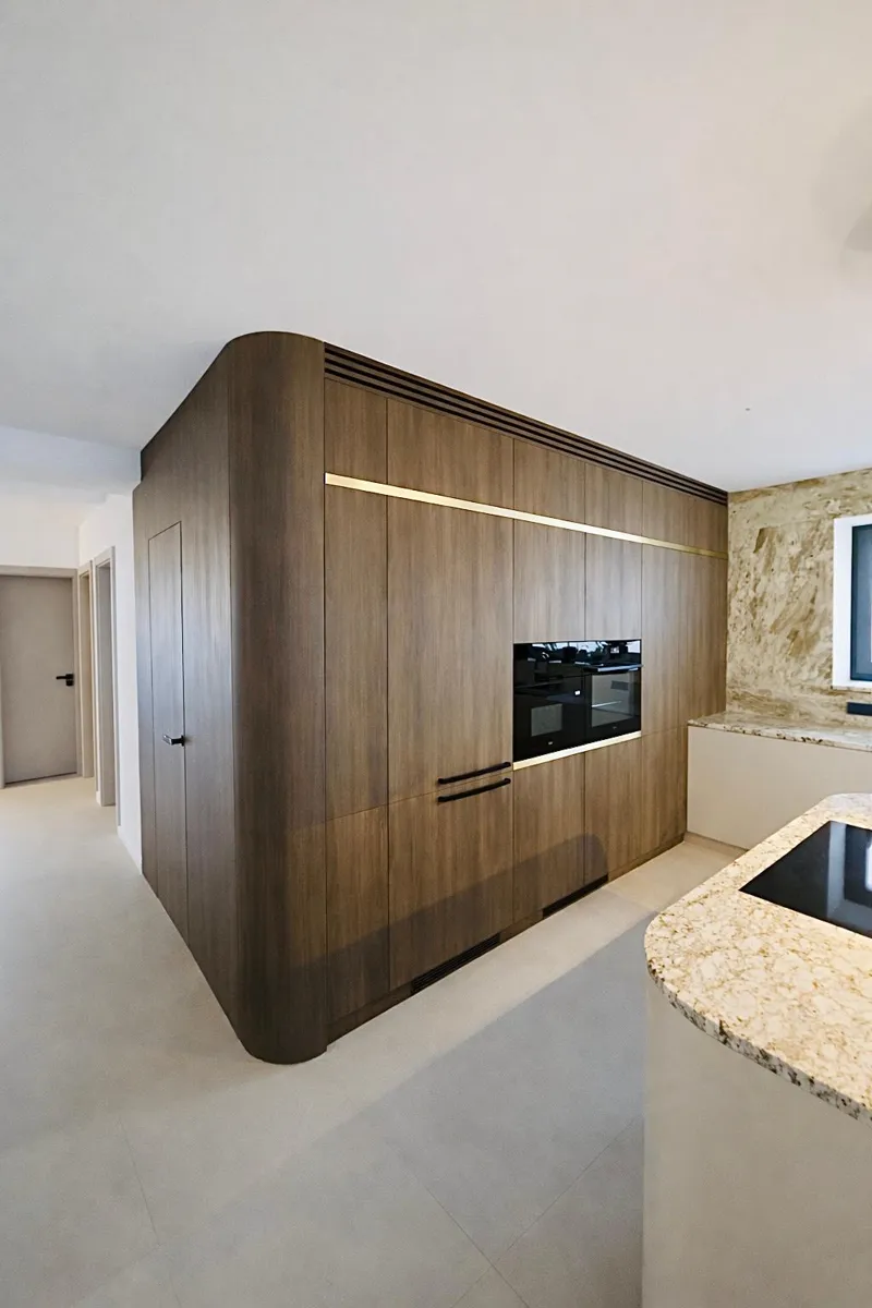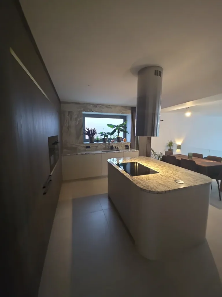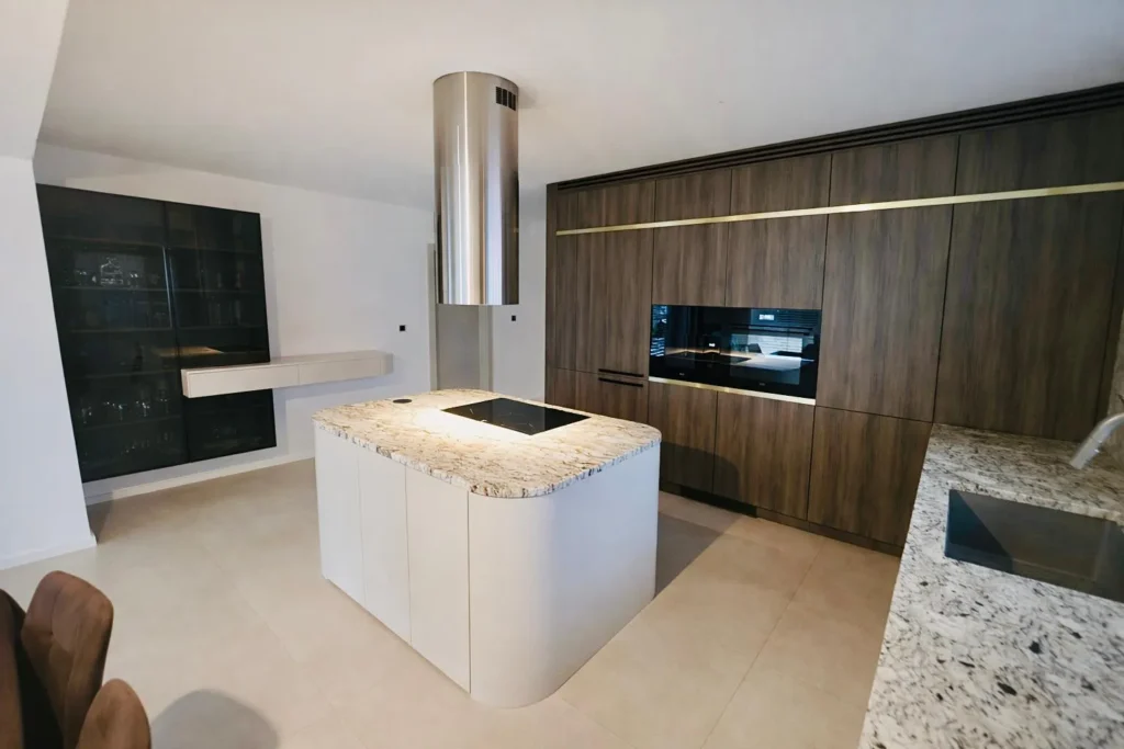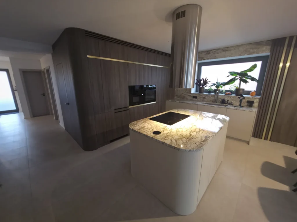 Dominant ist die Kücheninsel mit ihrer geschwungenen Form, die die Linienführung des Interieurs auf natürliche Weise abmildert und gleichzeitig maximalen Komfort im täglichen Gebrauch bietet. Die 3 cm dicke Arbeitsplatte aus Naturstein verleiht dem Raum einen luxuriösen Charakter und hohe Widerstandsfähigkeit.