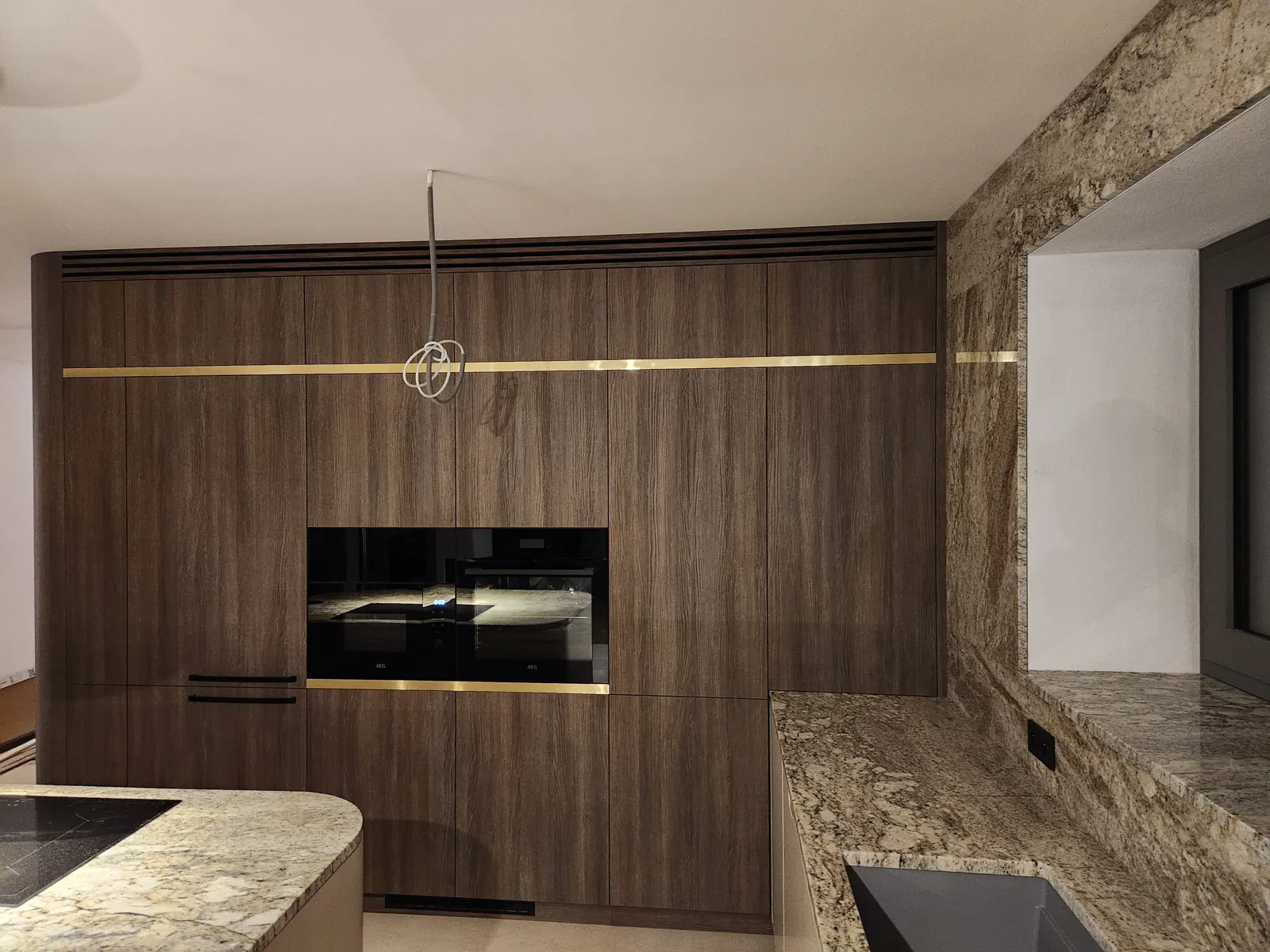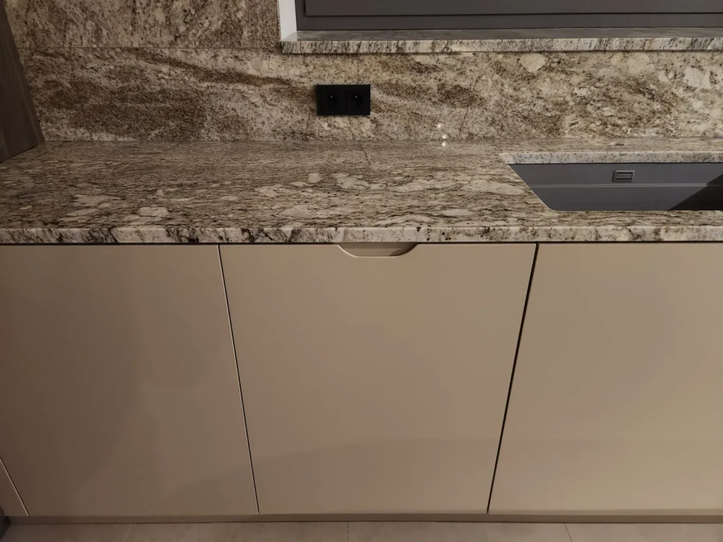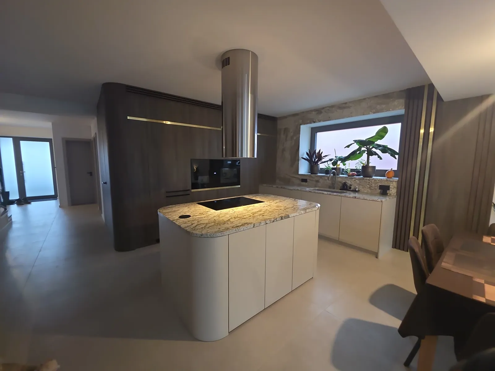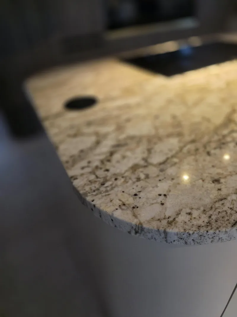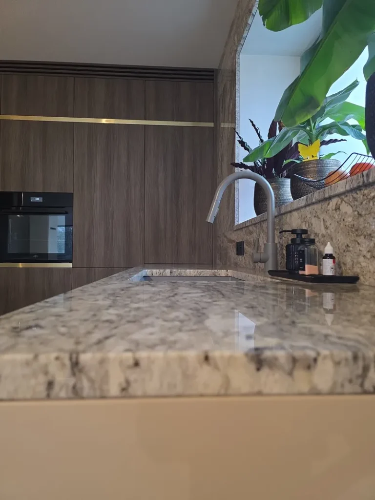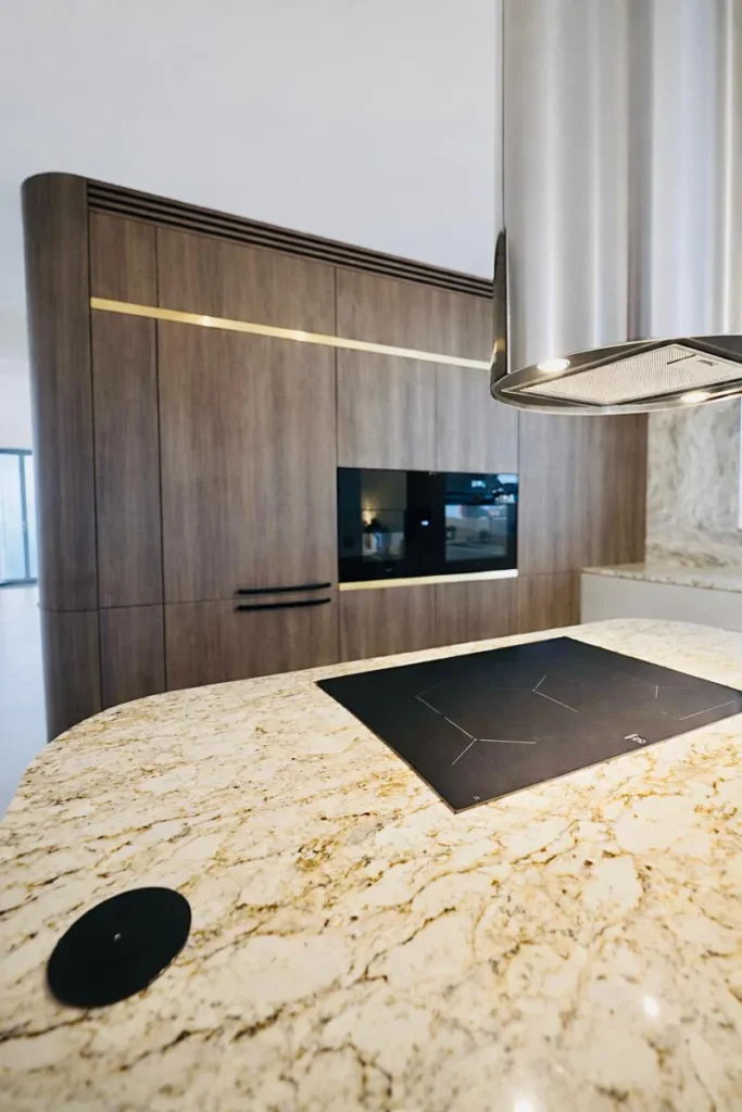 Dominant ist die Kücheninsel mit ihrer geschwungenen Form, die die Linienführung des Interieurs auf natürliche Weise abmildert und gleichzeitig maximalen Komfort im täglichen Gebrauch bietet. Die 3 cm dicke Arbeitsplatte aus Naturstein verleiht dem Raum einen luxuriösen Charakter und hohe Widerstandsfähigkeit.