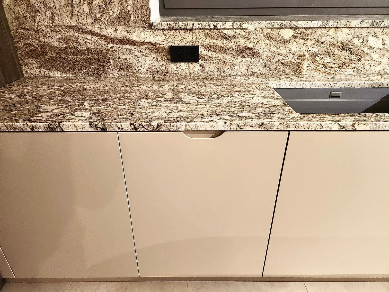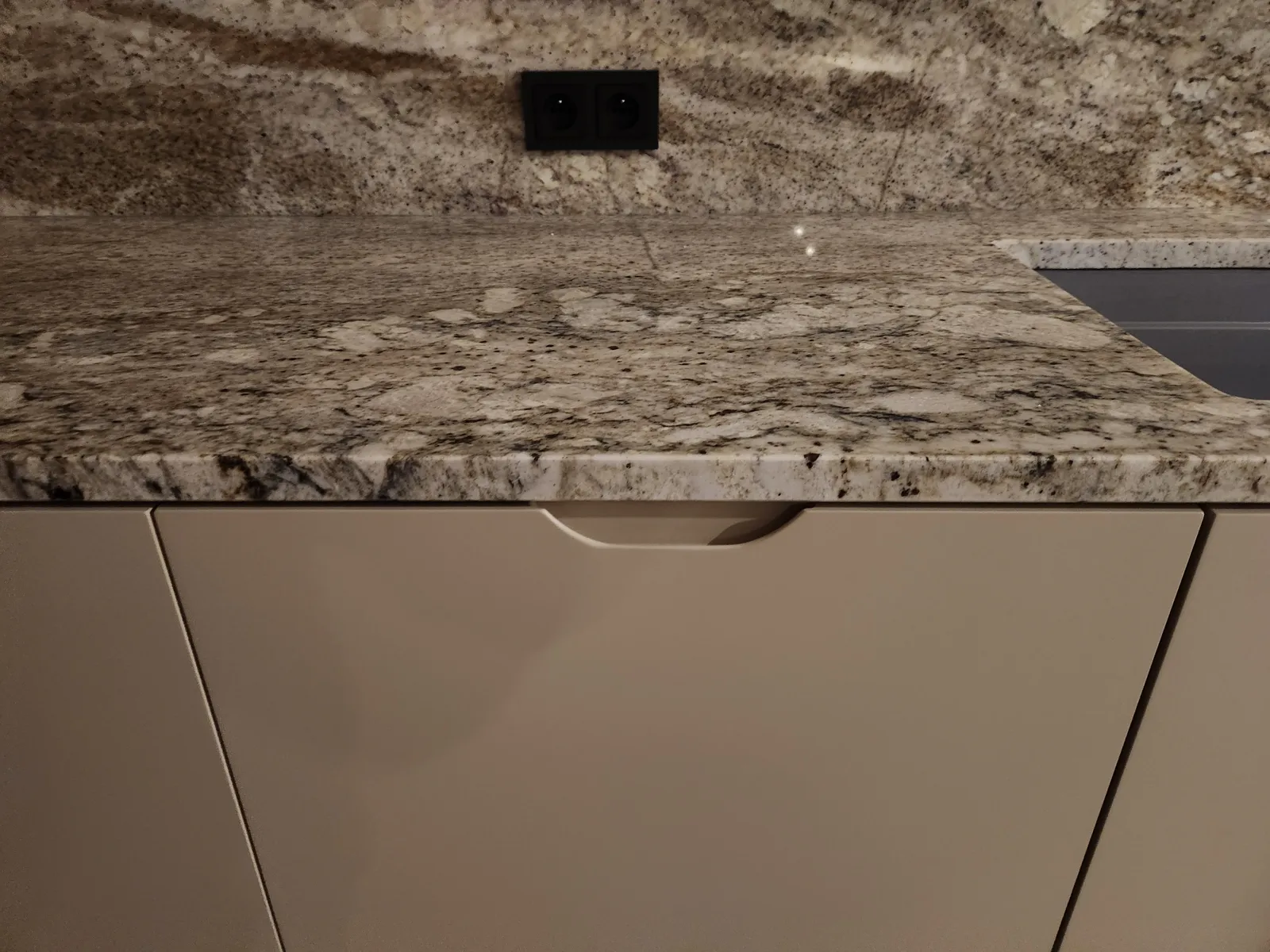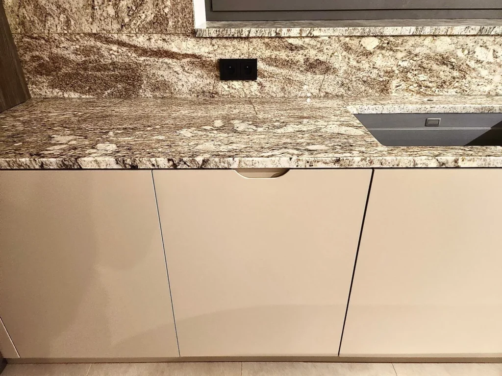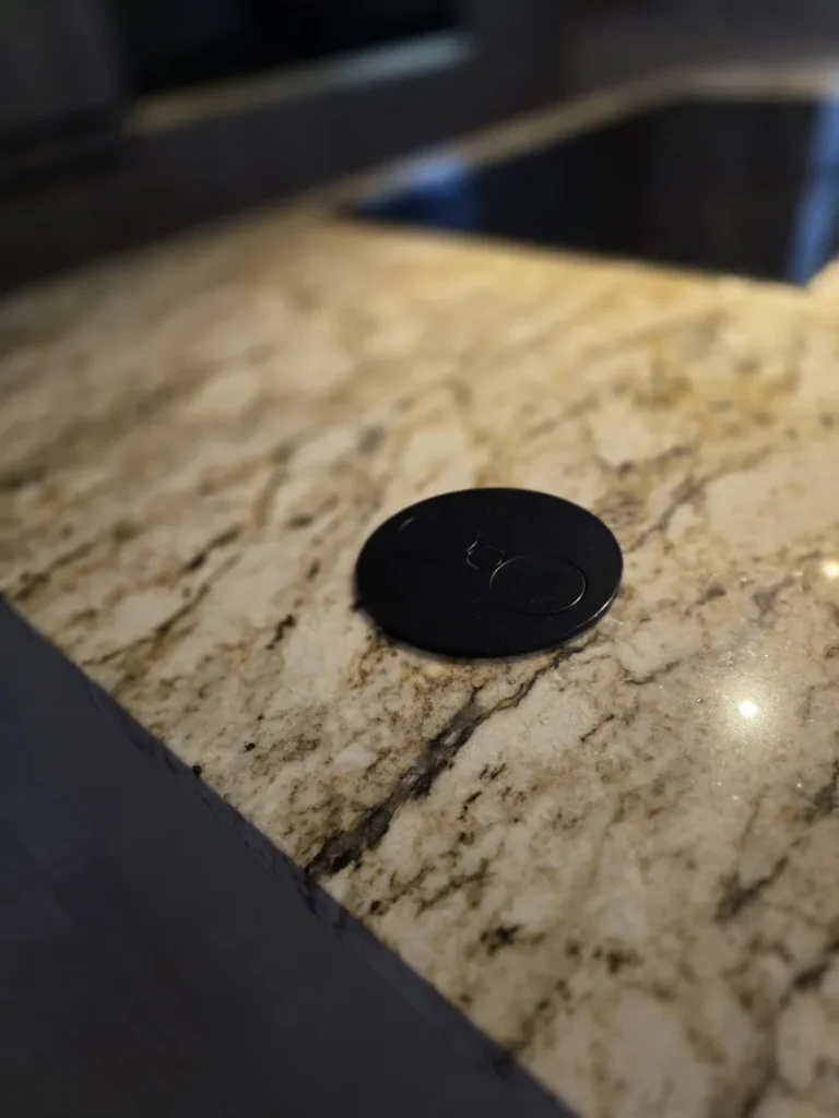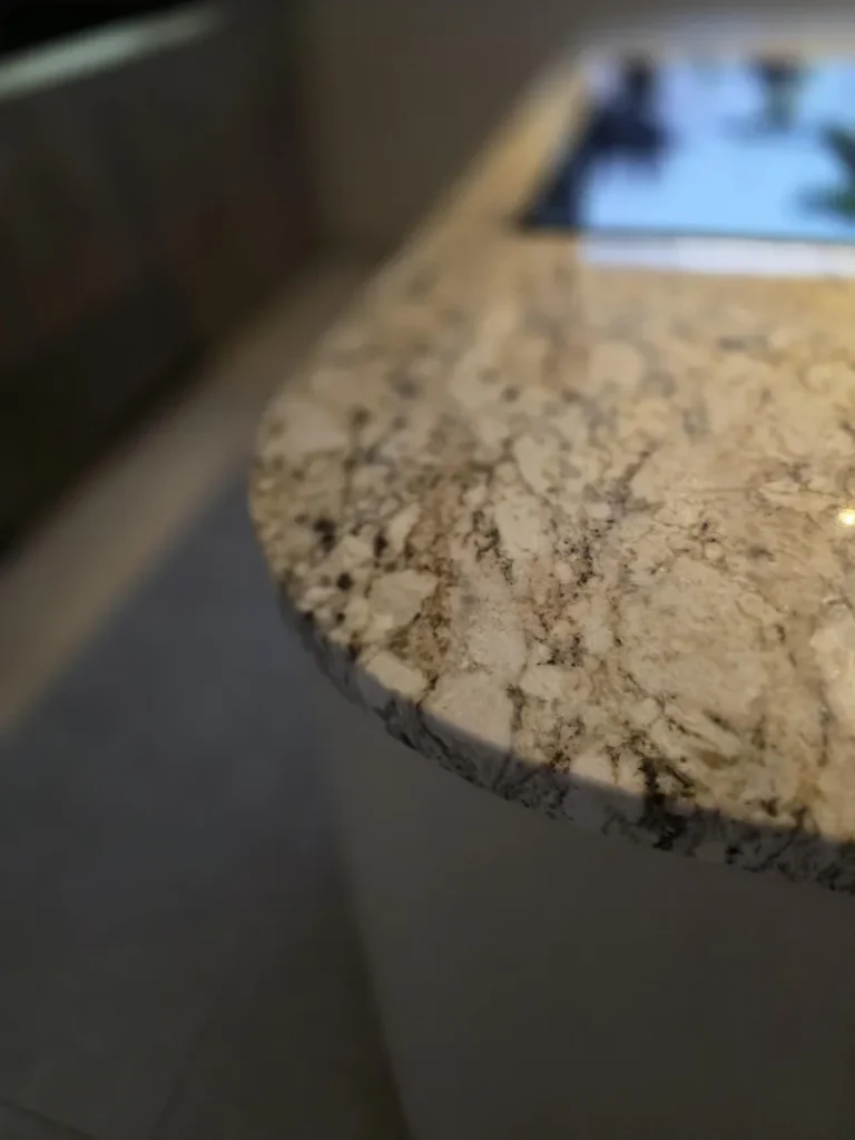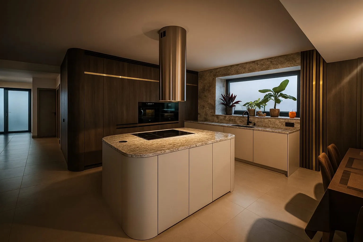 Dominant ist die Kücheninsel mit ihrer geschwungenen Form, die die Linienführung des Interieurs auf natürliche Weise abmildert und gleichzeitig maximalen Komfort im täglichen Gebrauch bietet. Die 3 cm dicke Arbeitsplatte aus Naturstein verleiht dem Raum einen luxuriösen Charakter und hohe Widerstandsfähigkeit.