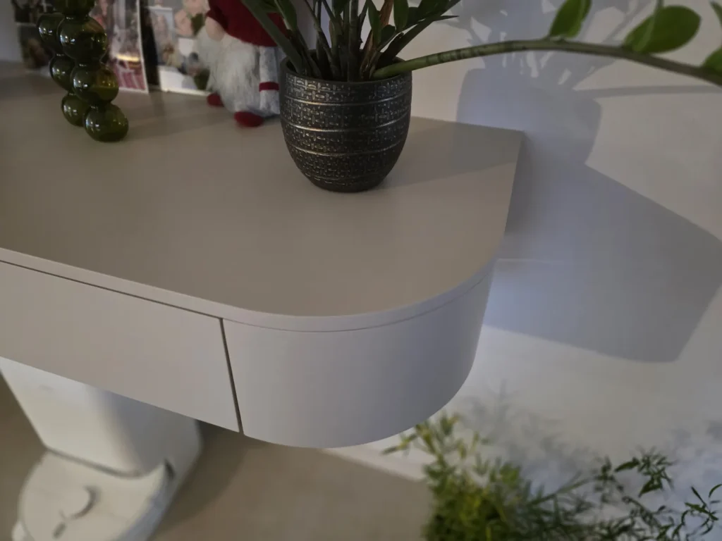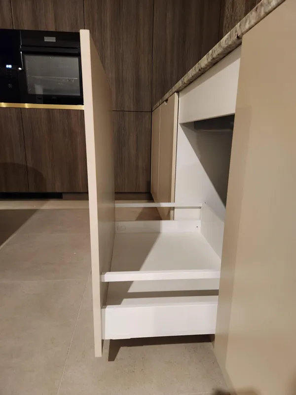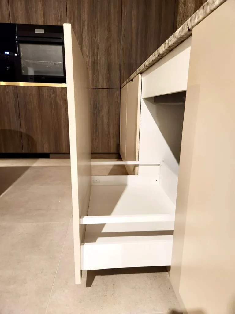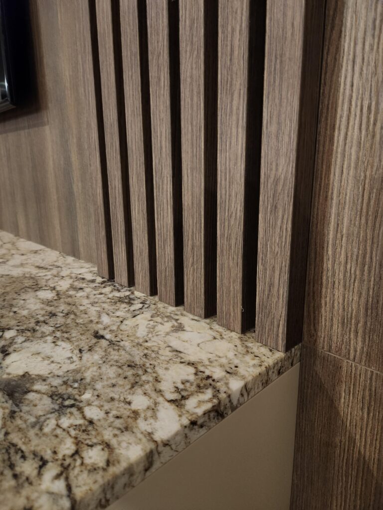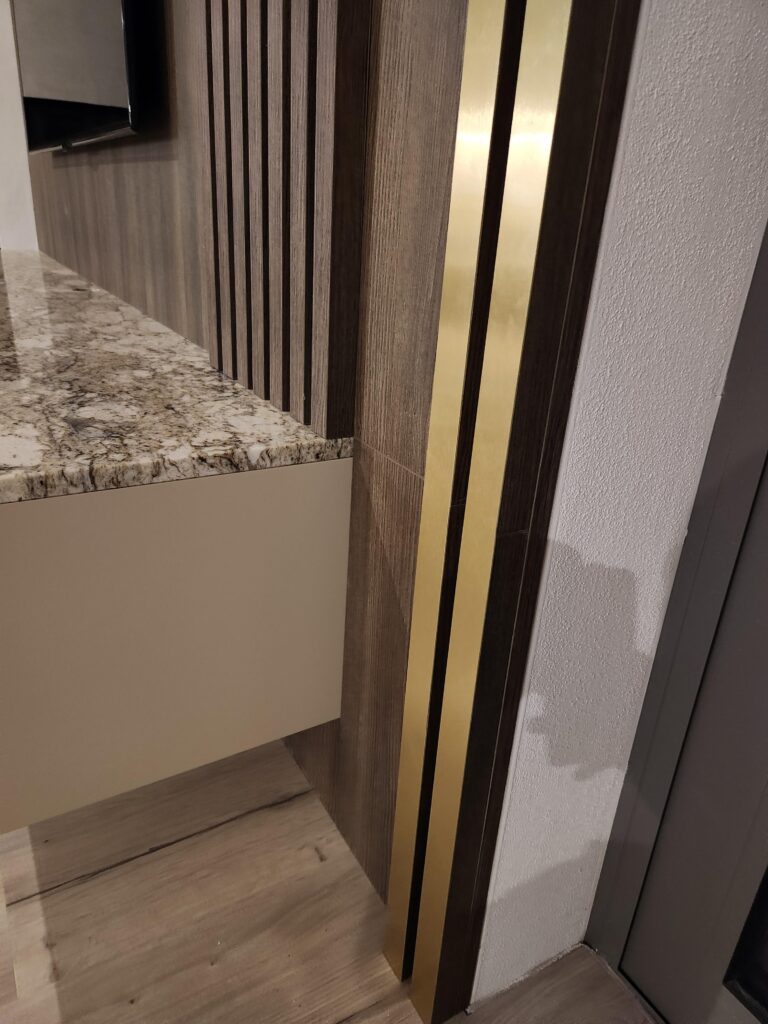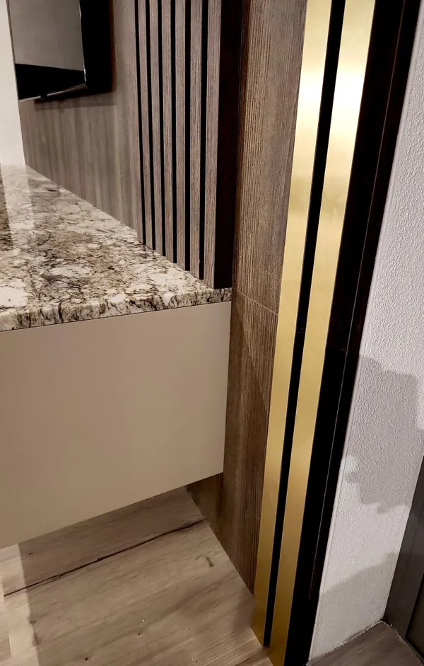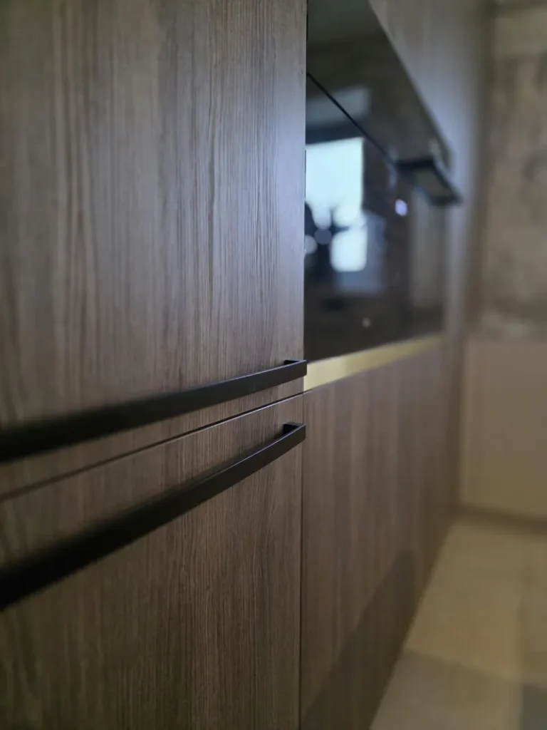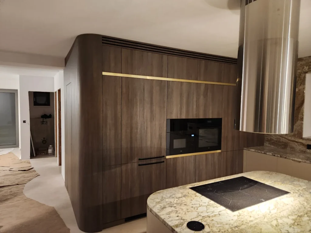 Das verwendete Holzdekor Kronospan K548 Smoked Kala Ash sorgt für Tiefe und Eleganz, ergänzt durch lackierte Flächen im Farbton NCS S 2005-Y60R. Ein markantes Designelement sind die mit Resopal-Kanten versehenen goldenen Linien, die den Möbeln ein exklusives Detail und visuelle Leichtigkeit verleihen.