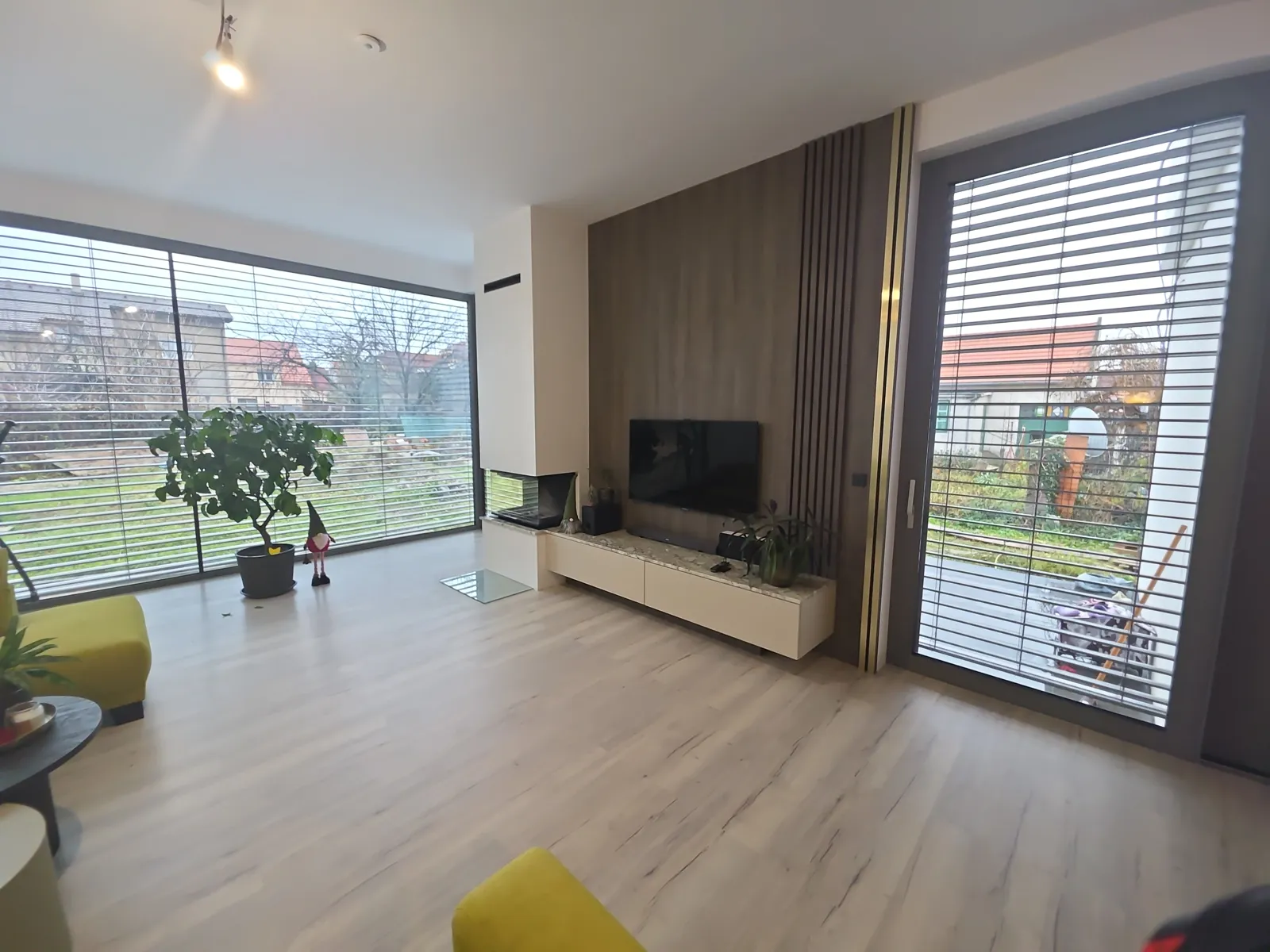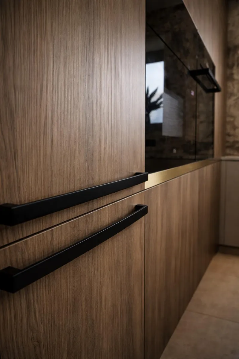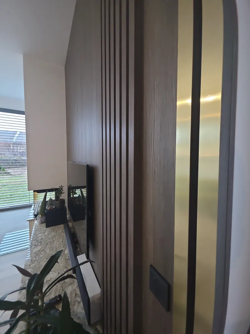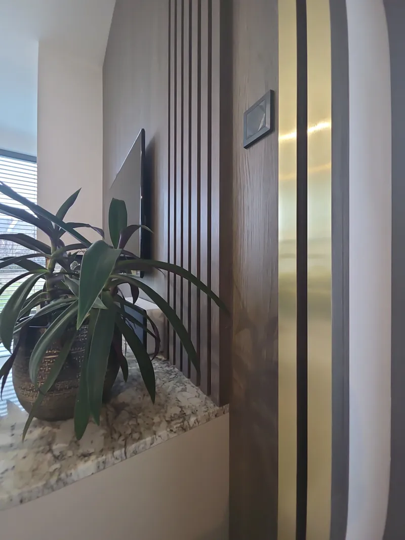 Selbstverständlich sorgen hochwertige Blum Merivobox-Beschläge für einen reibungslosen und leisen Lauf der Schubladen. Die Türen zur Kammer sind mit verdeckten Tectus 3D-Scharnieren versehen, wodurch das klare und minimalistische Erscheinungsbild des Raumes erhalten bleibt. Abgerundet wird das Ganze durch Aluminiumrahmen in mattem Schwarz mit Planibel Dark Grey-Glas. Der Wohnbereich schließt nahtlos an die Küche an und bildet ein harmonisches Ganzes. Dominierendes Element ist die Wandkombination mit TV-Panel, bei der sich das Dekor Smoked Kala Ash in Kombination mit vertikalen Lamellen und goldenen Designdetails wiederholt.
