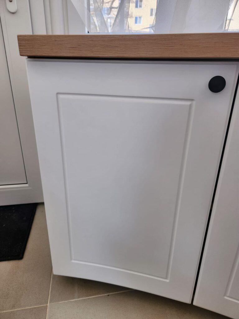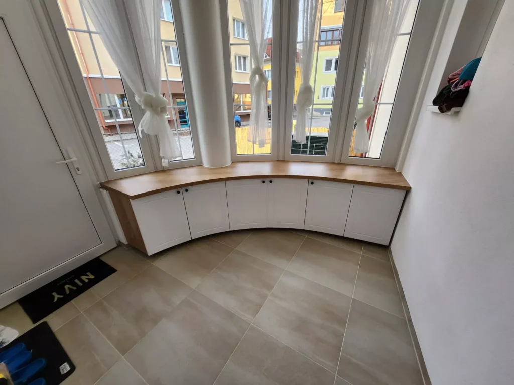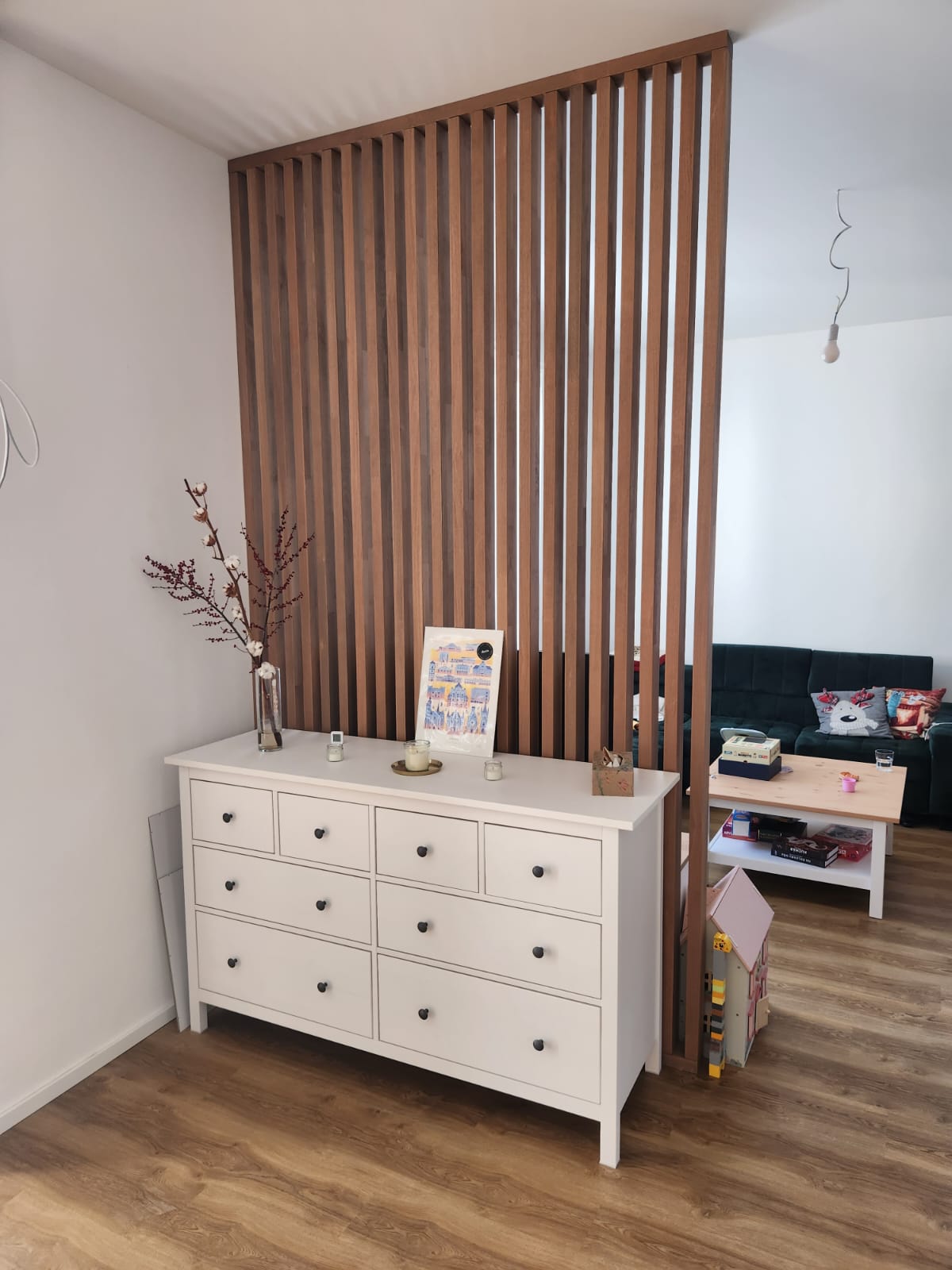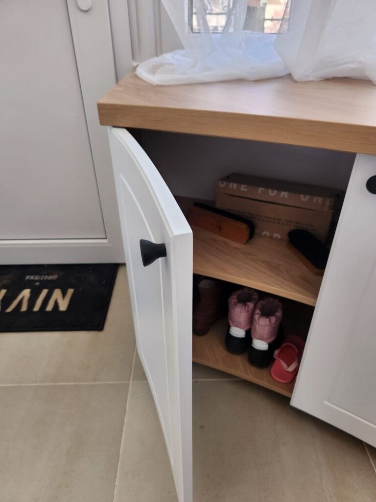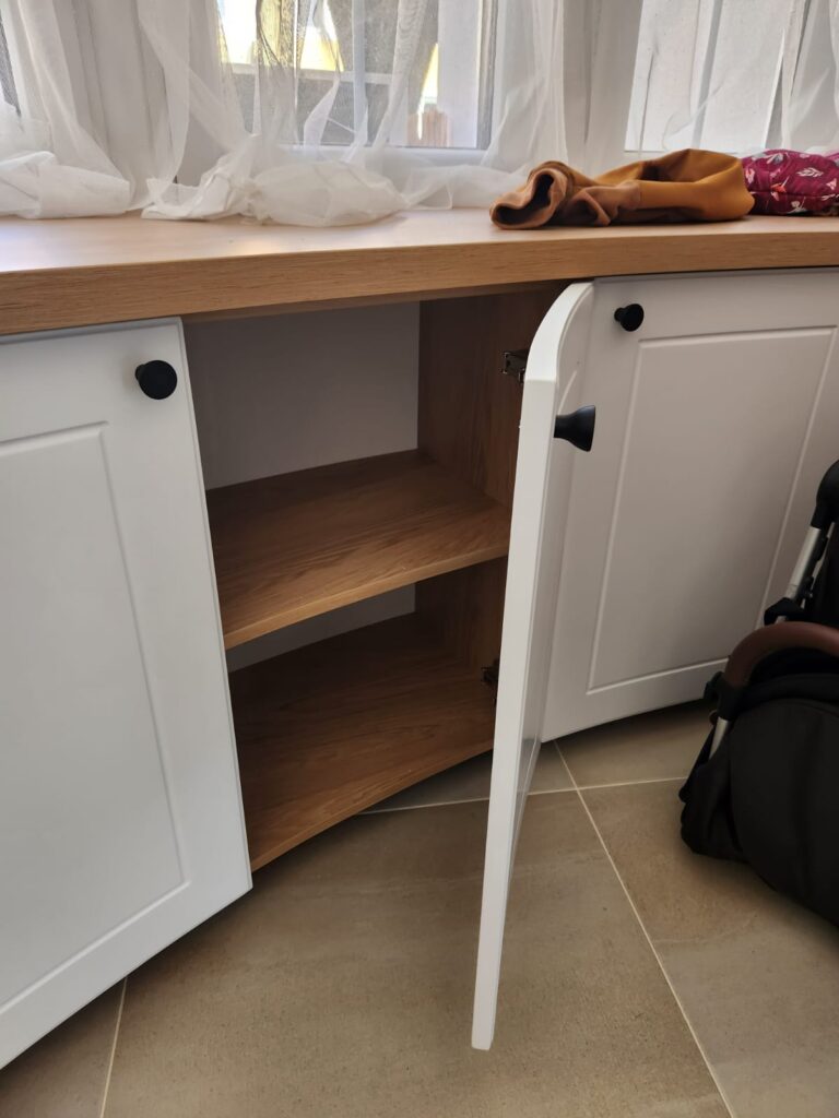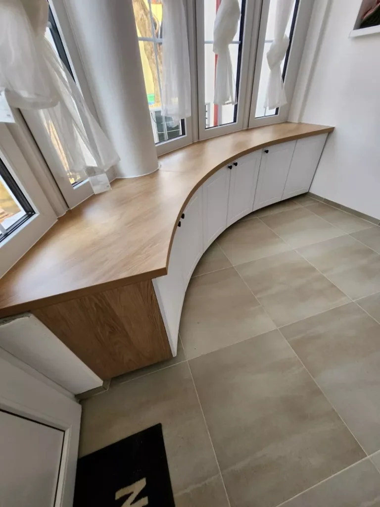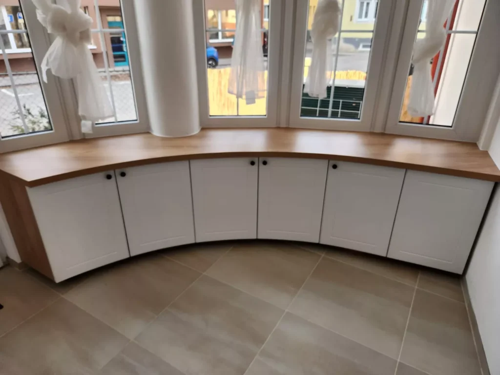 Skrinka na topánky verne kopíruje „oblúk“ steny ktorý sme pomocou šablón a kopýt preniesli na nábytok dvierka sú z drážkovanej MDF, Lakované do RAL 9003 mat.